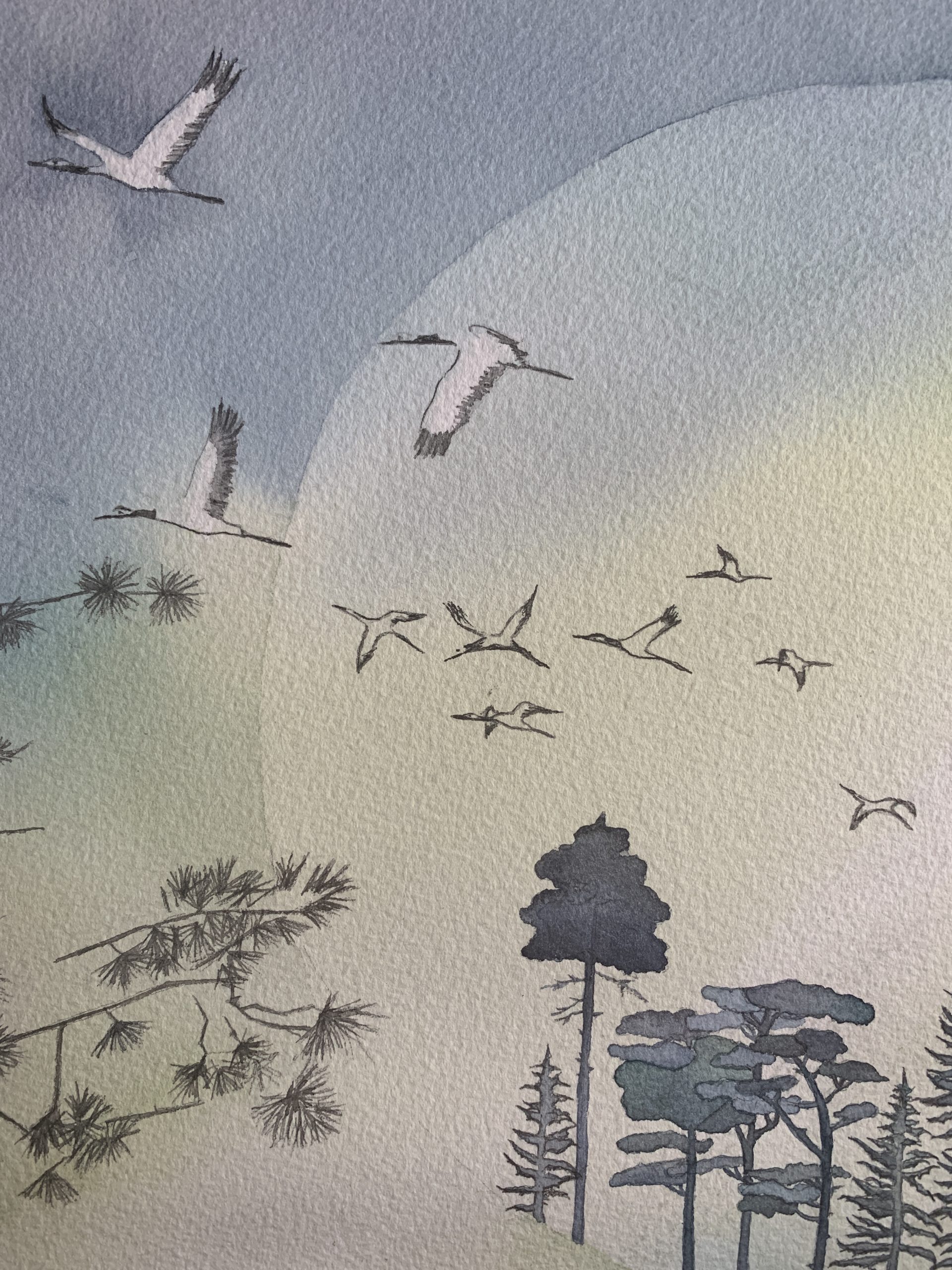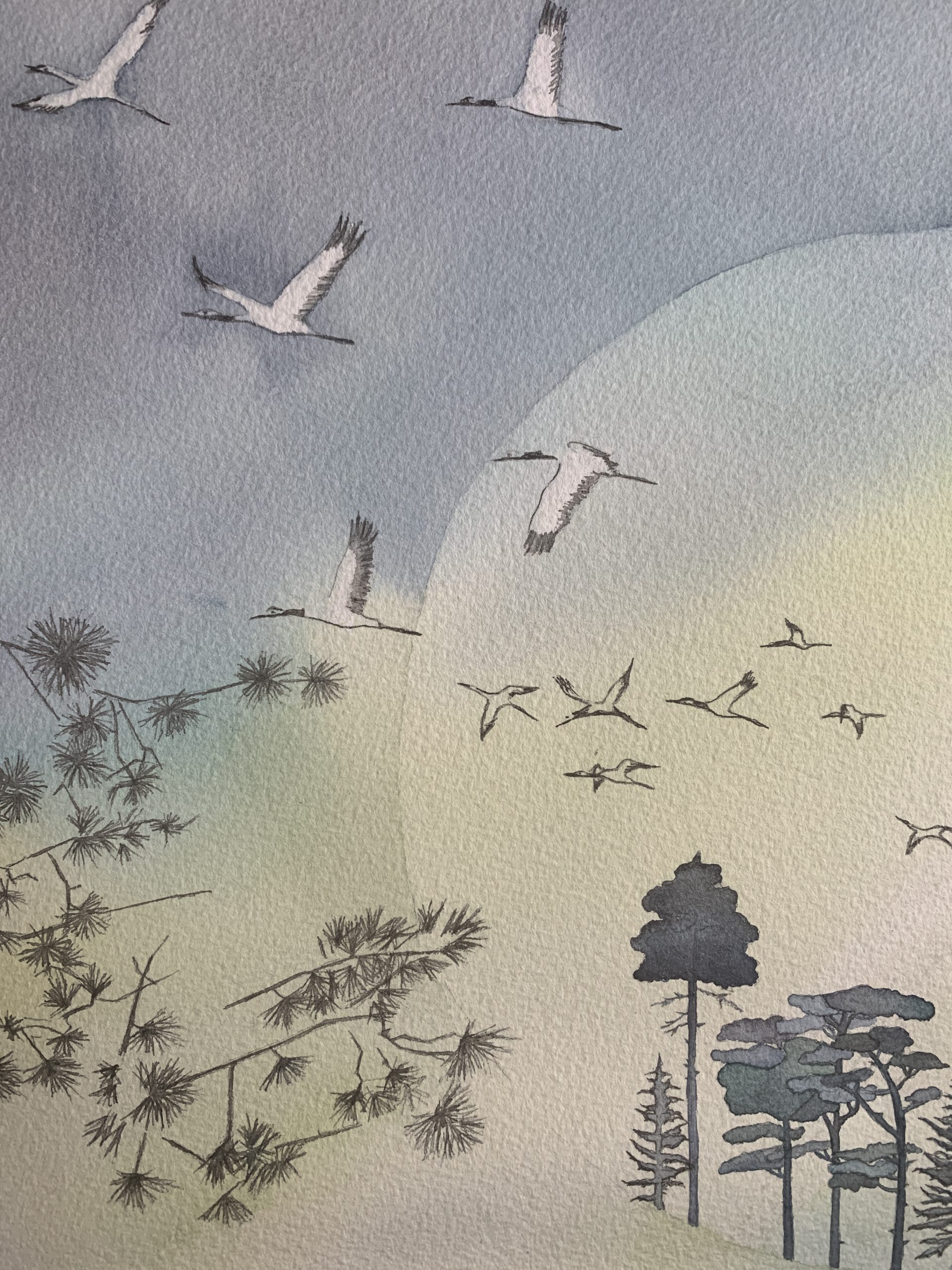 Cette peinture est la suite d’une série d’aquarelles intitulées « Le voyage » avec comme thème, les oiseaux migrateurs
