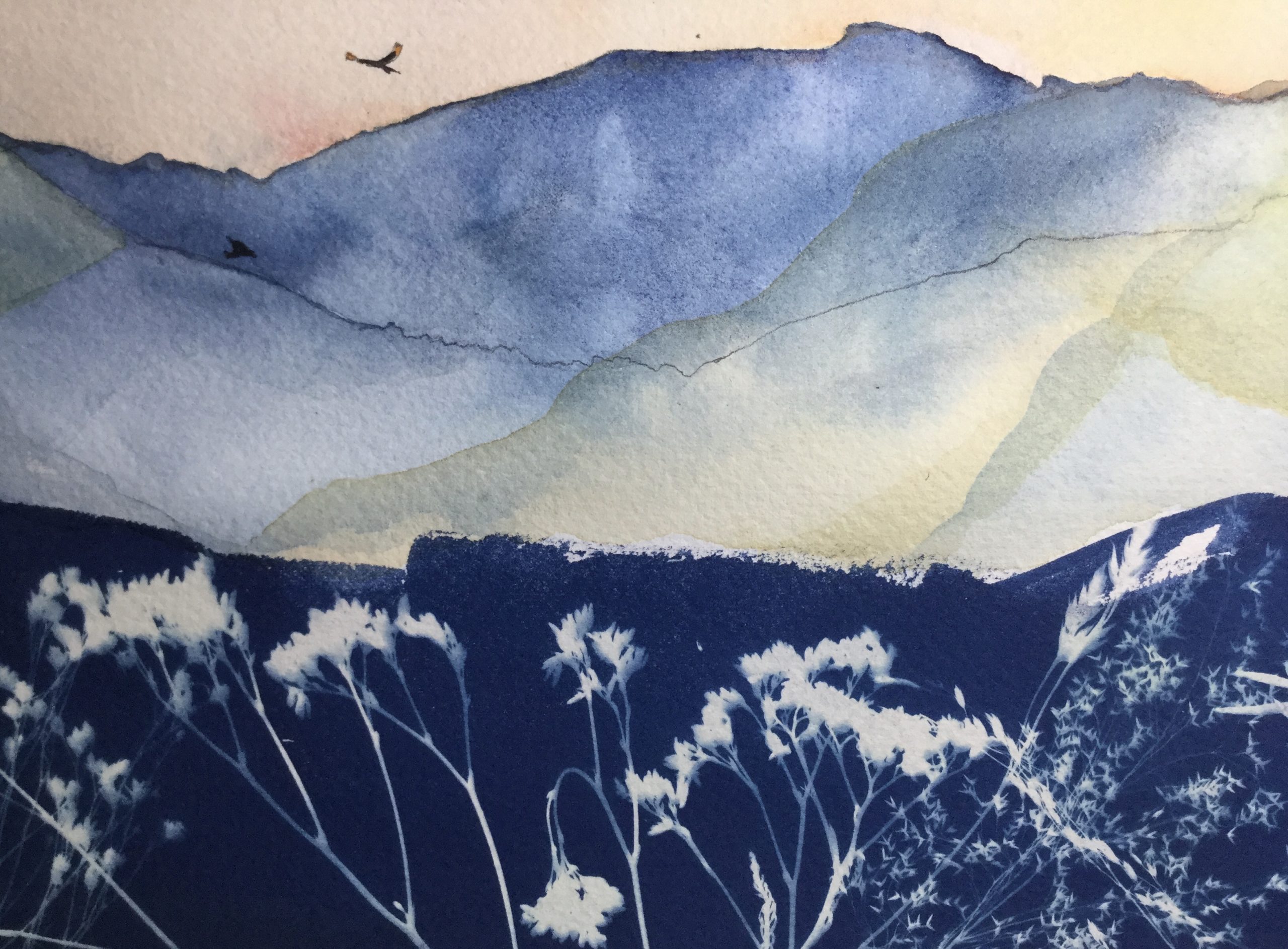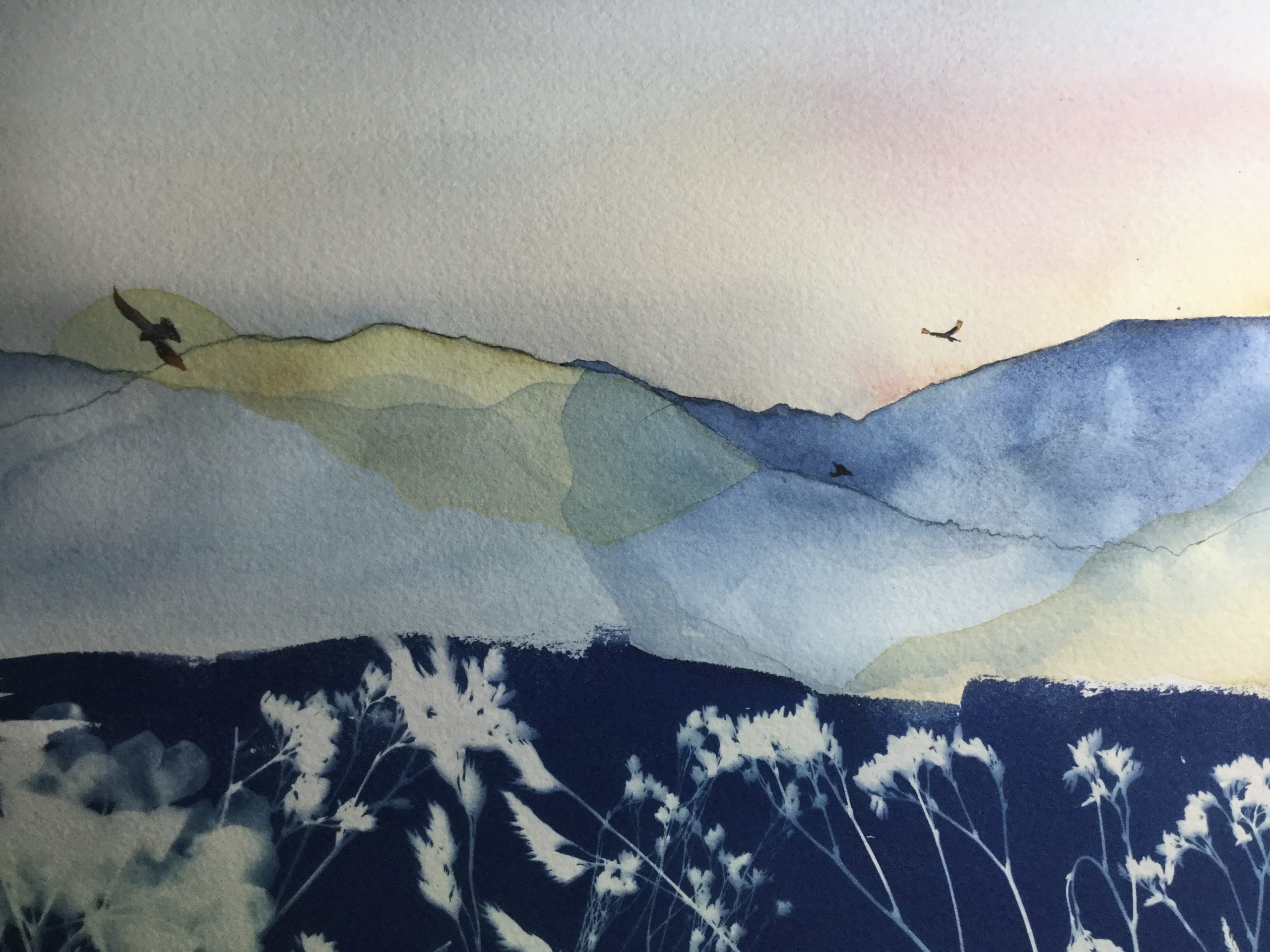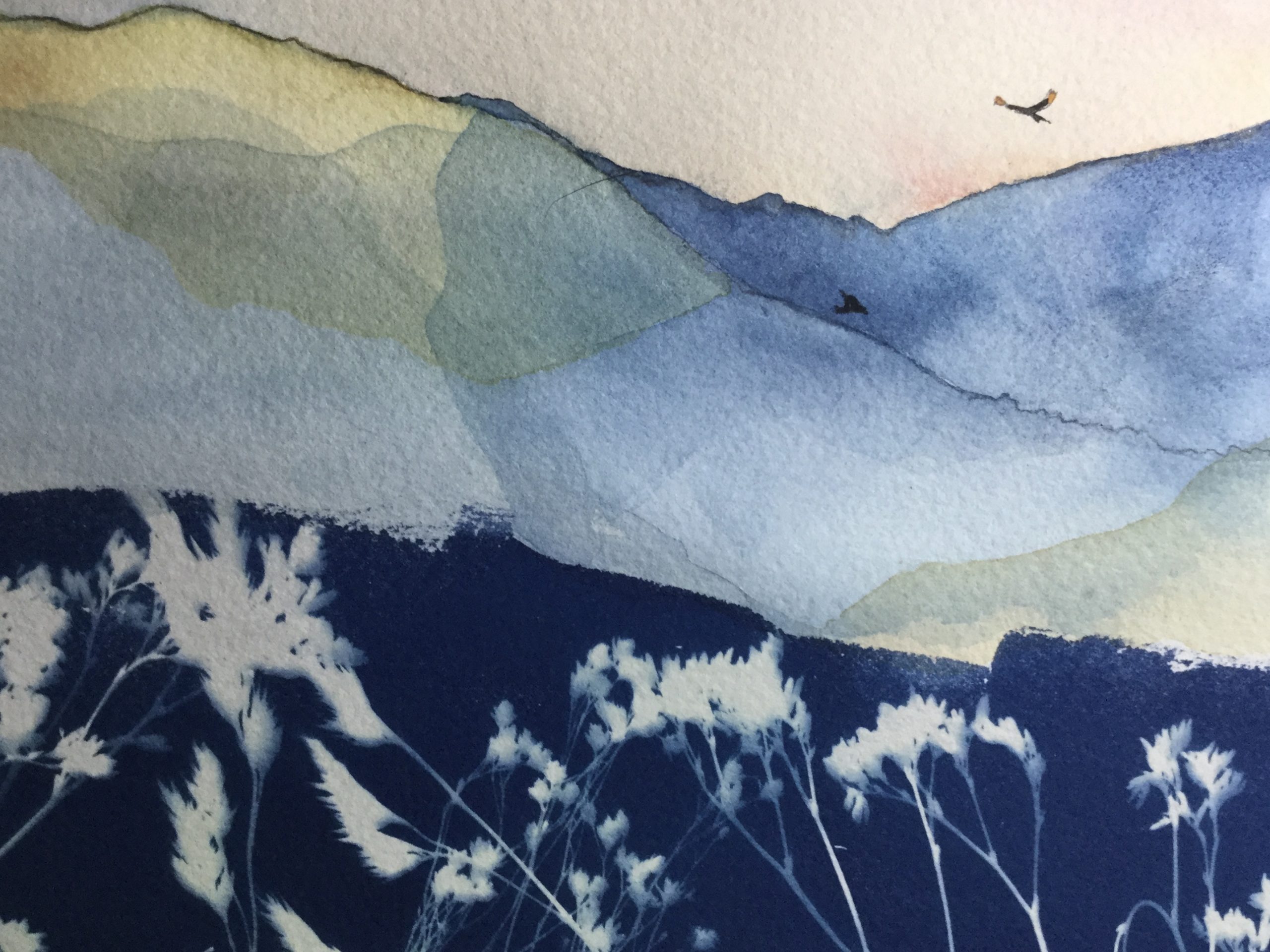 Cette peinture a une particularité : en plus de l’aquarelle, j’ai ajouté un procédé photographique monochrome négatif ancien, par le biais duquel on obtient un tirage photographique bleu de Prusse, bleu cyan : il s’agit d’un procédé appelé cyanotype. J’apprécie beaucoup le mélange de ces 2 techniques car il s’en dégage une poésie particulière.