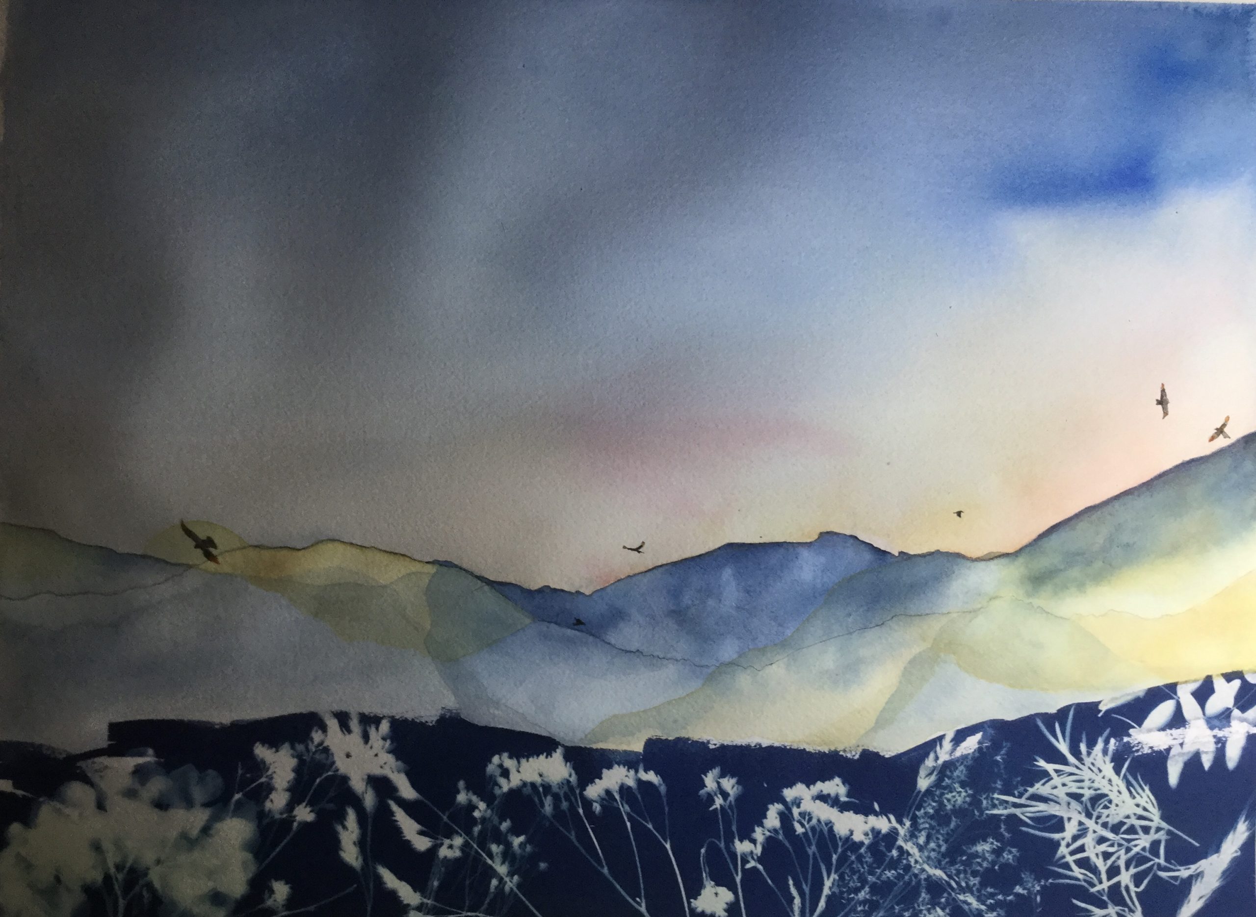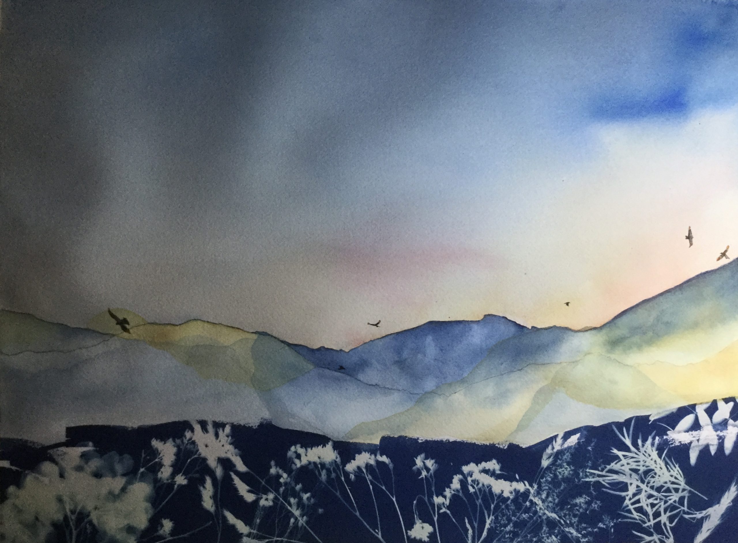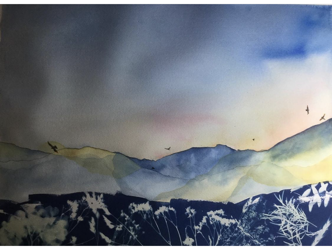 Cette peinture a une particularité : en plus de l’aquarelle, j’ai ajouté un procédé photographique monochrome négatif ancien, par le biais duquel on obtient un tirage photographique bleu de Prusse, bleu cyan : il s’agit d’un procédé appelé cyanotype. J’apprécie beaucoup le mélange de ces 2 techniques car il s’en dégage une poésie particulière.