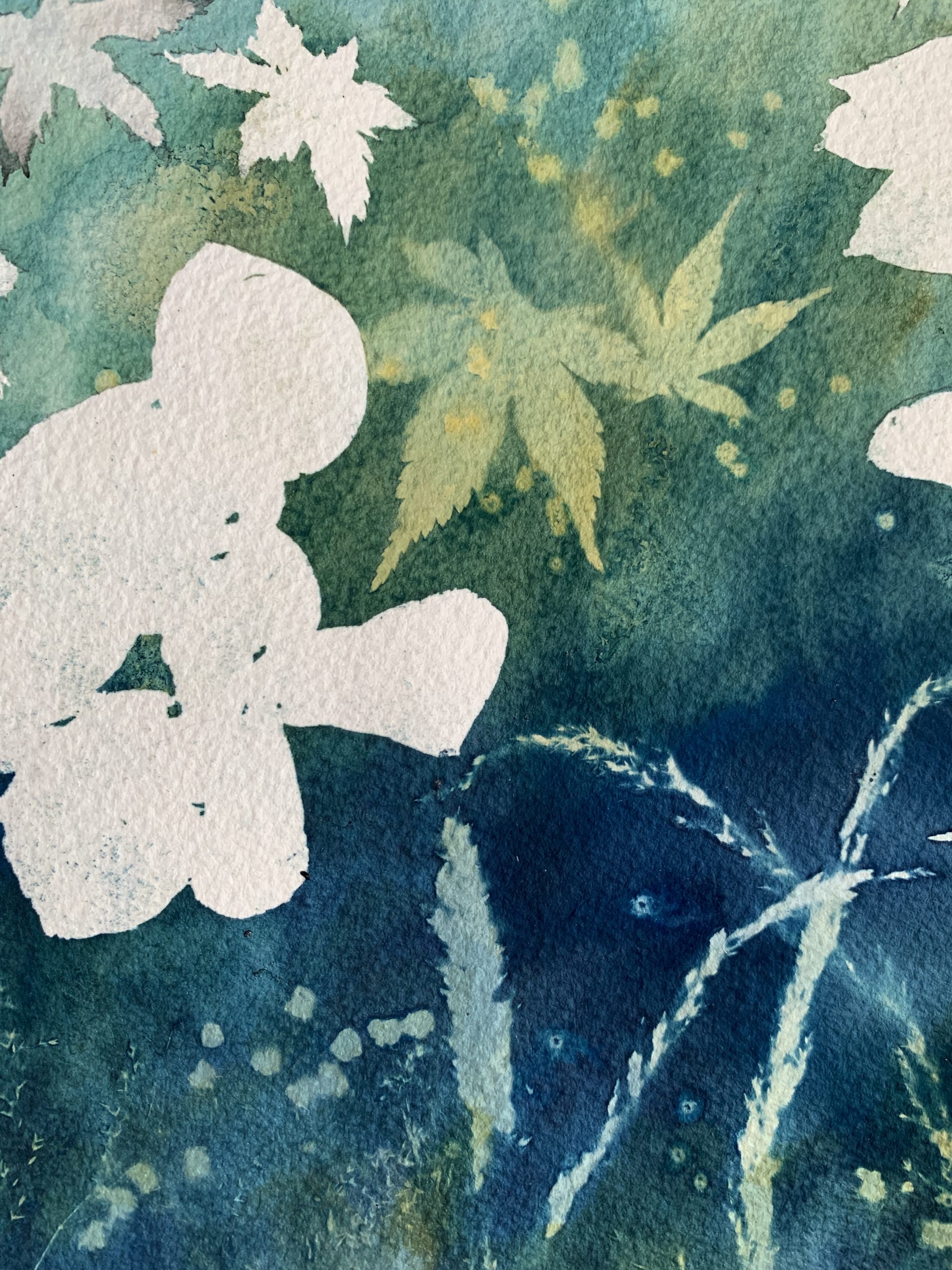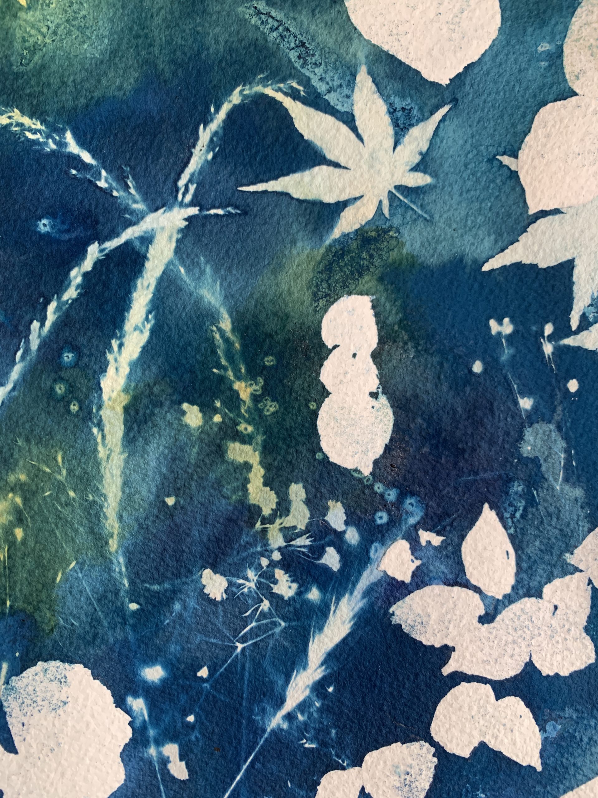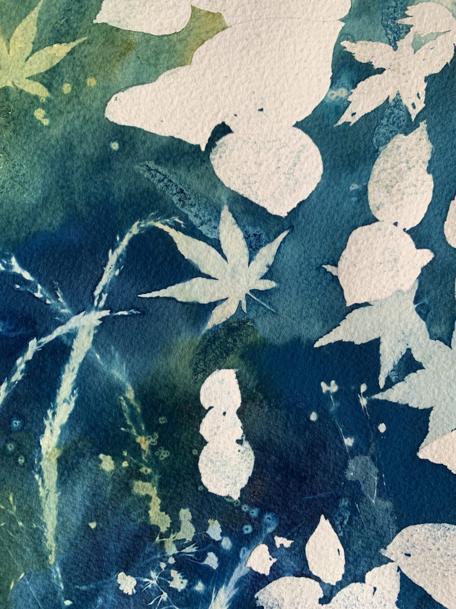 Lorsque le soleil est à son apogée, il m’arrive de délaisser un peu mes pinceaux pour créer des compositions à partir de cette technique magique, imprévisible et qui invite à la rêverie. J’utilise le cyanotype parfois seul ou parfois mélangé à de l’aquarelle ou de la gouache.
