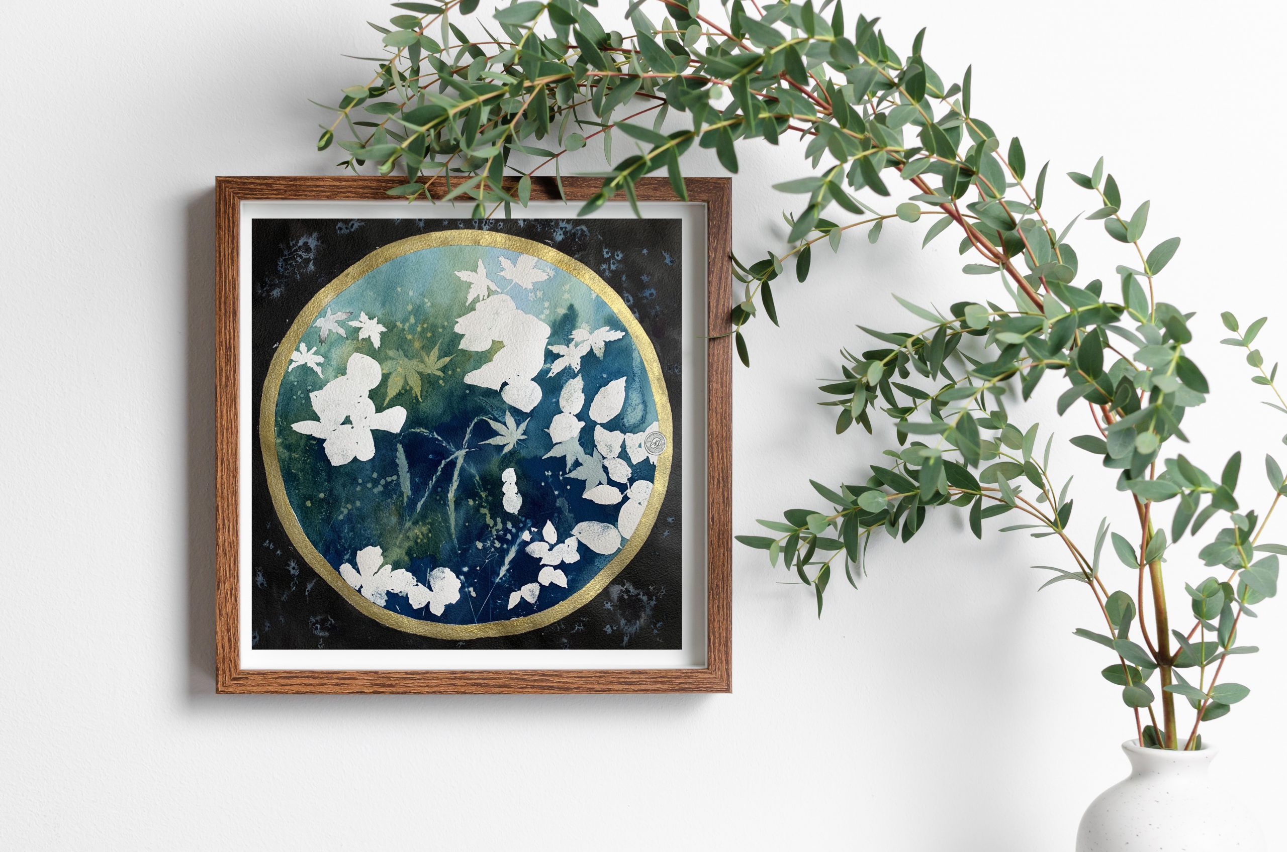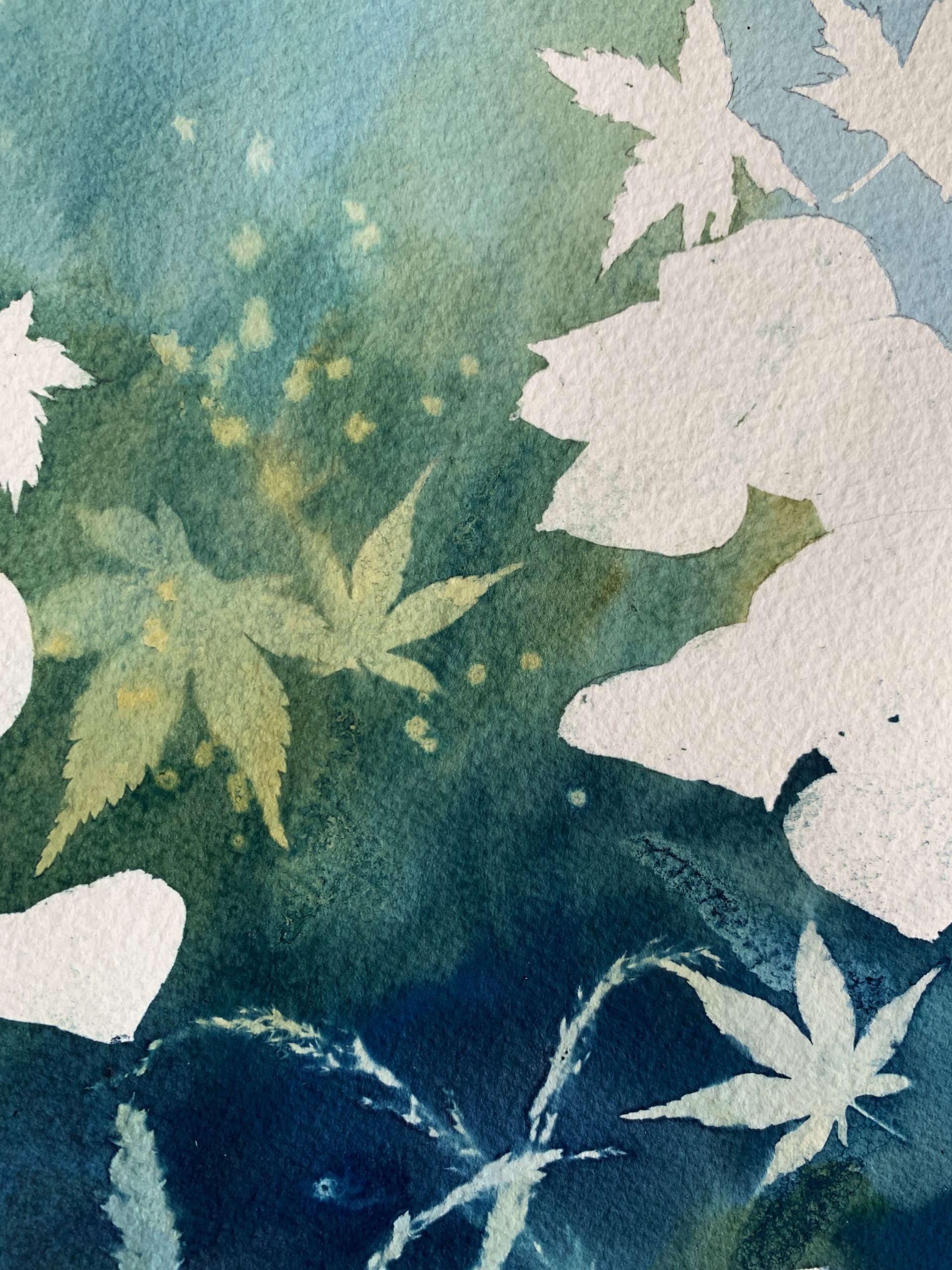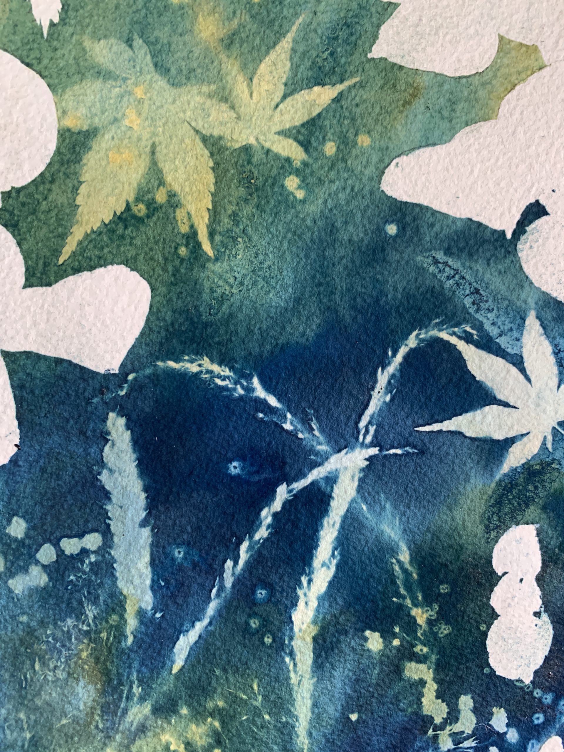 Lorsque le soleil est à son apogée, il m’arrive de délaisser un peu mes pinceaux pour créer des compositions à partir de cette technique magique, imprévisible et qui invite à la rêverie. J’utilise le cyanotype parfois seul ou parfois mélangé à de l’aquarelle ou de la gouache.