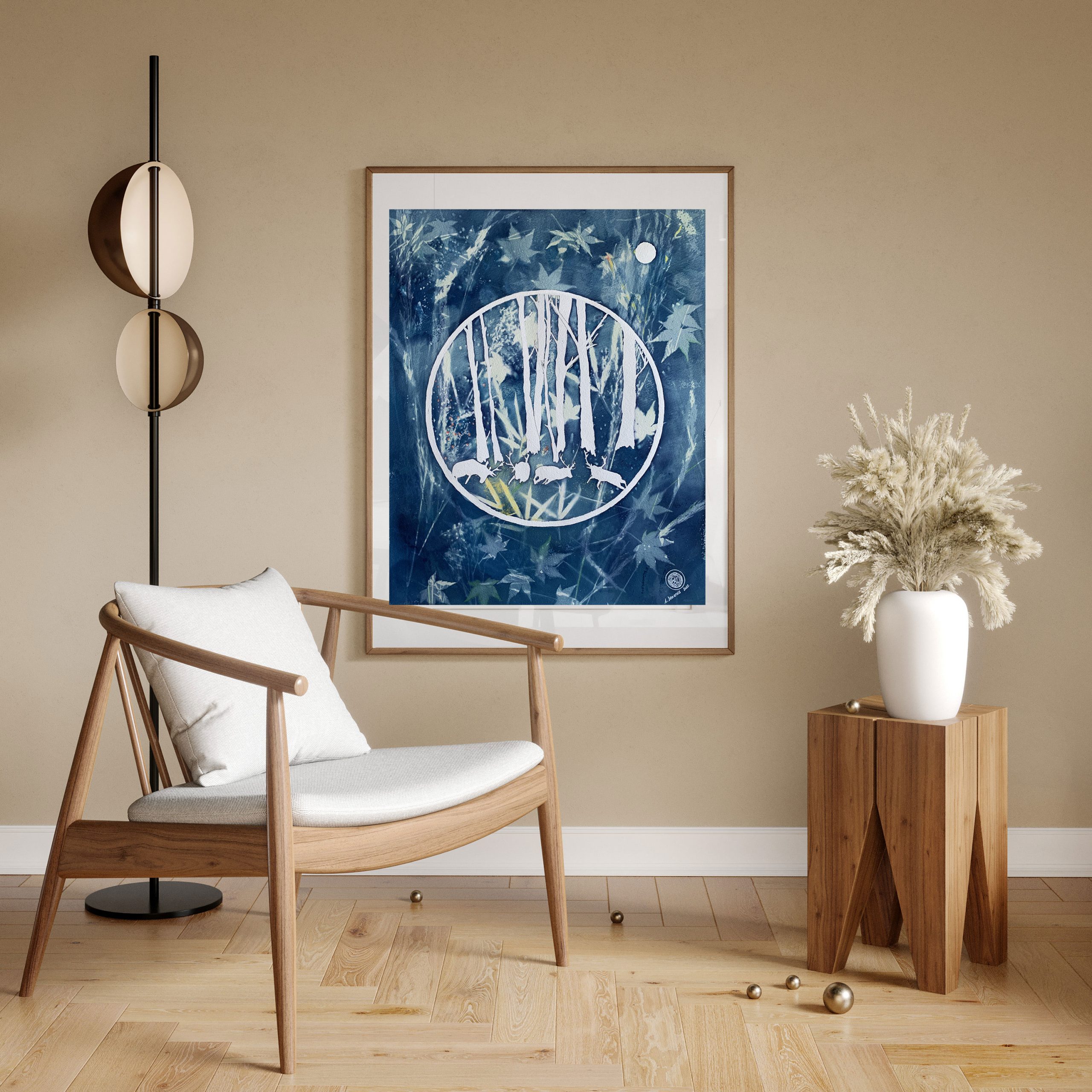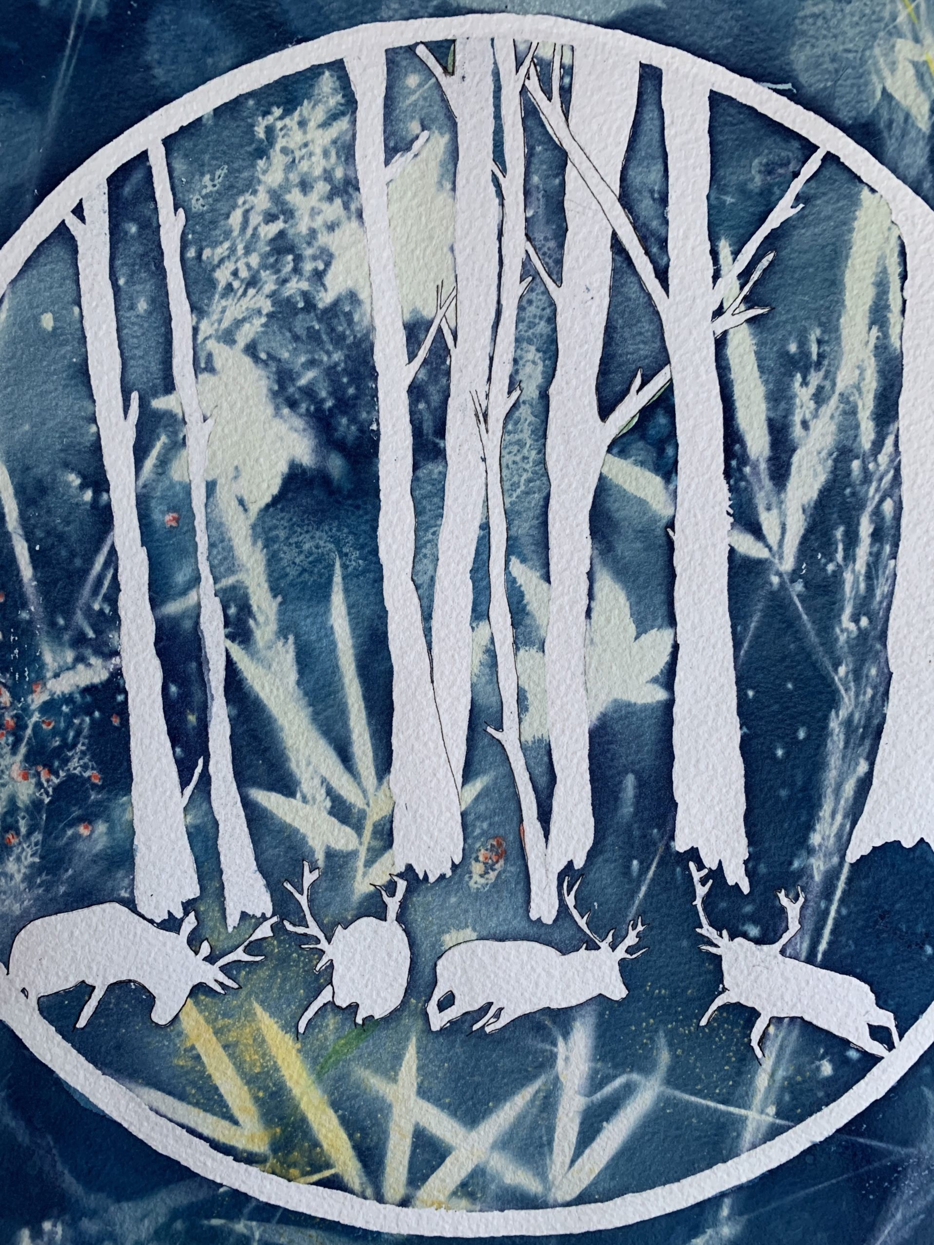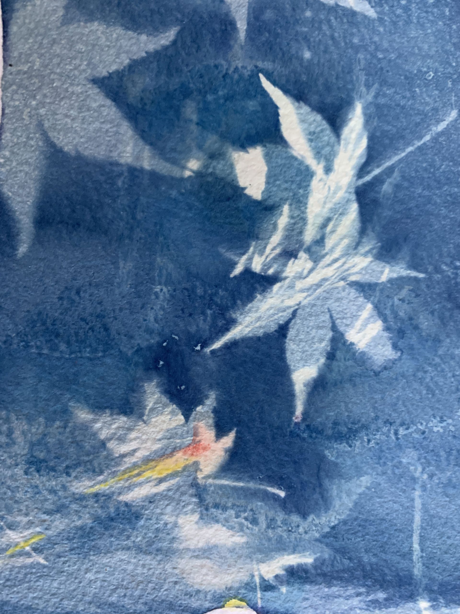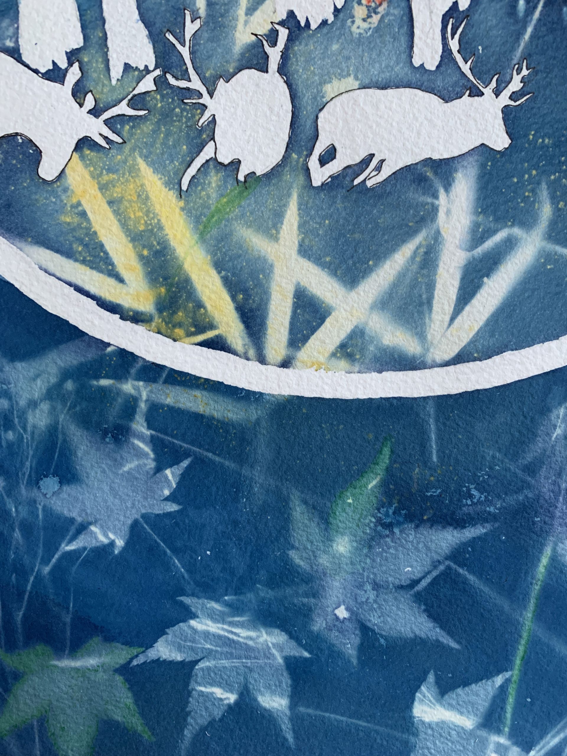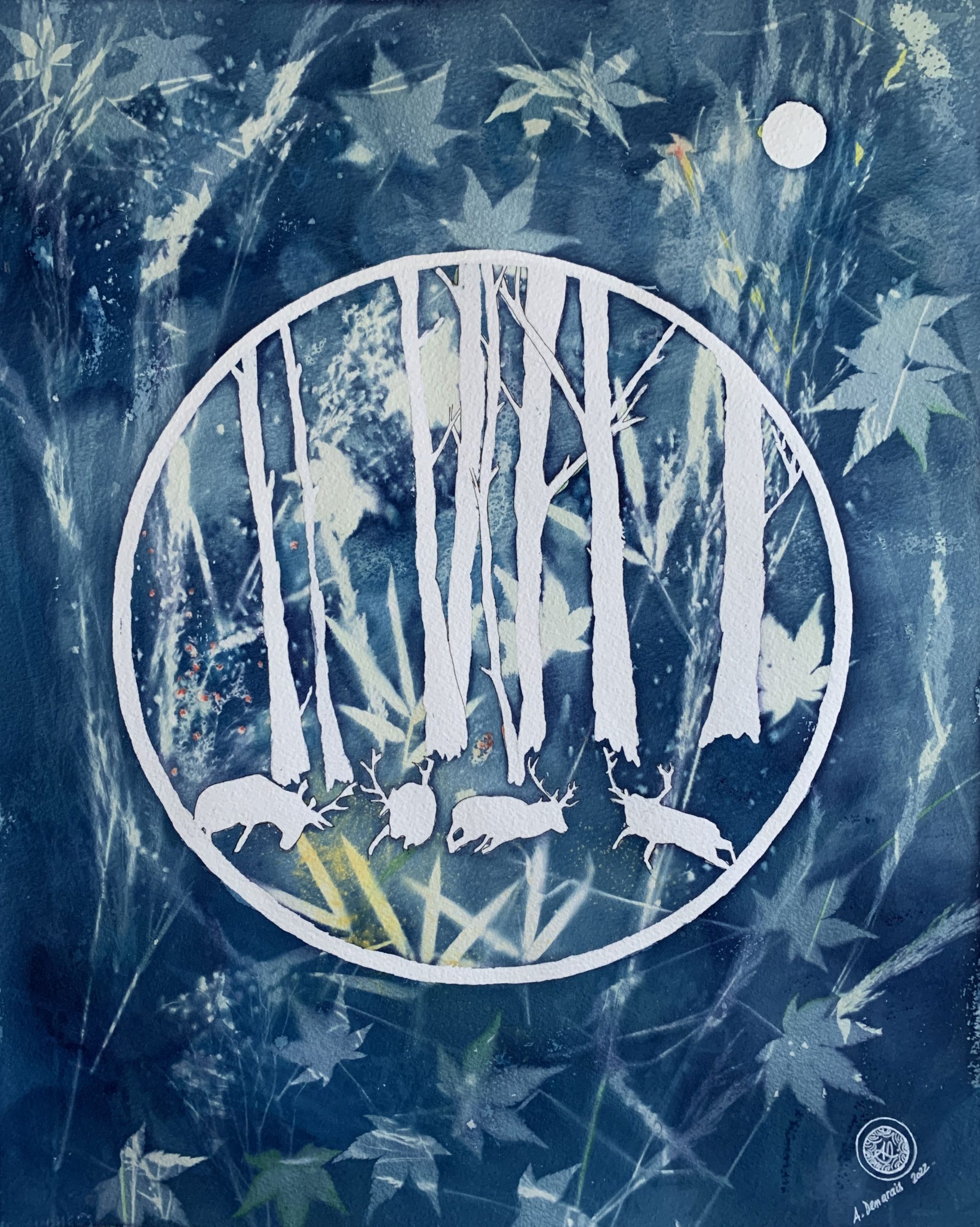 Lorsque le soleil est à son apogée, il m’arrive de délaisser un peu mes pinceaux pour créer des compositions à partir de cette technique magique, imprévisible et qui invite à la rêverie. J’utilise le cyanotype parfois seul ou parfois mélangé à de l’aquarelle ou de la gouache.