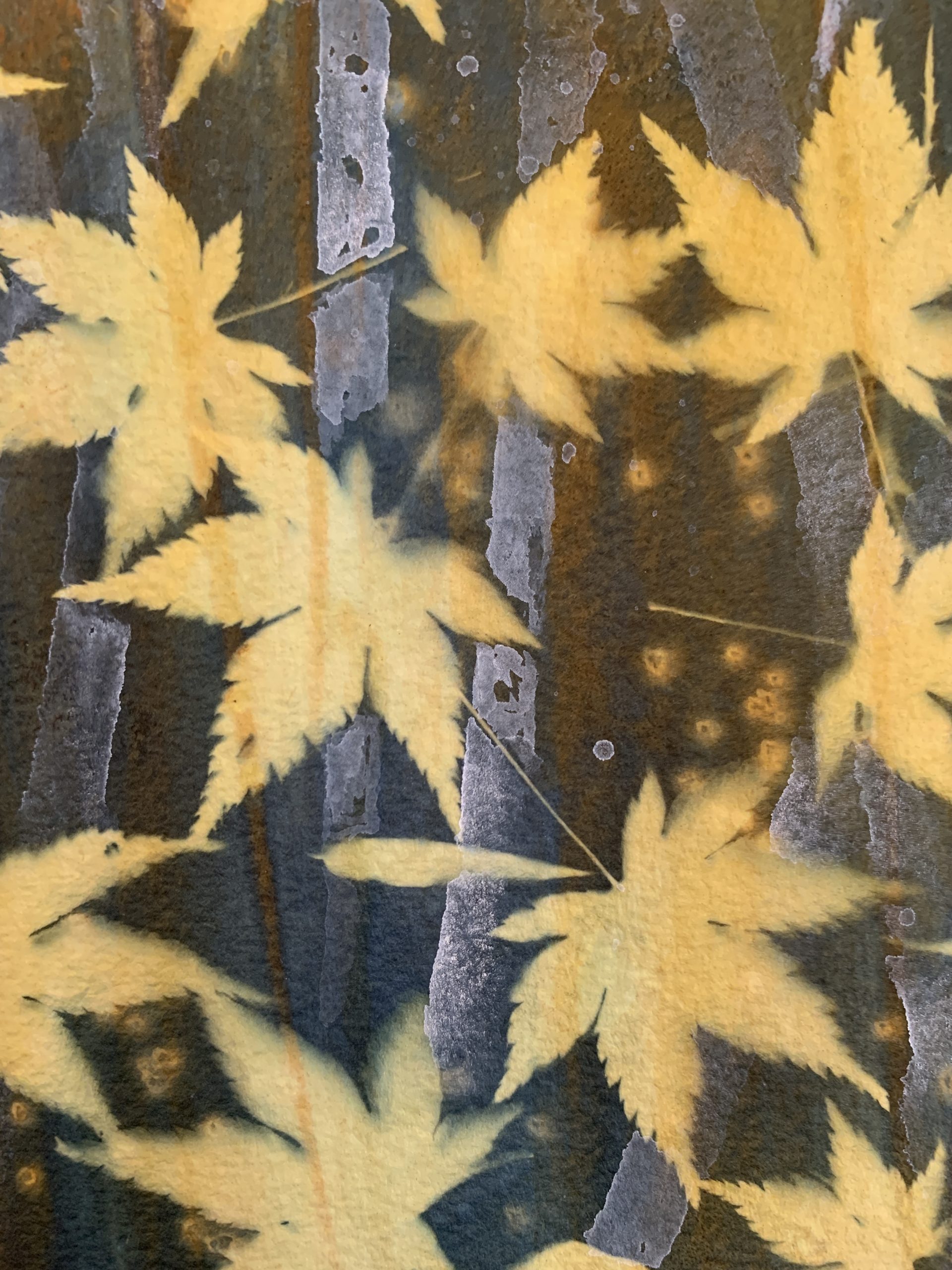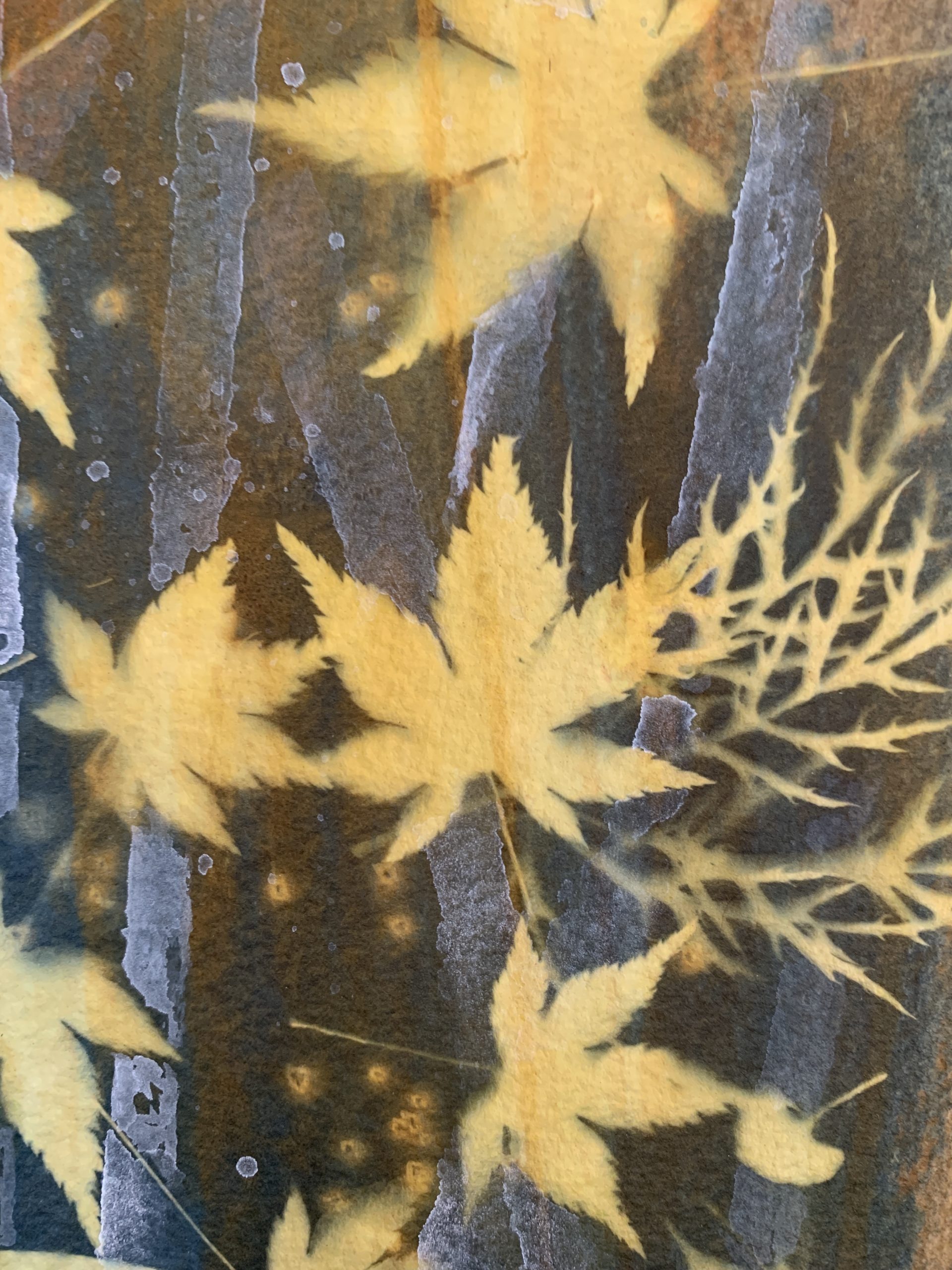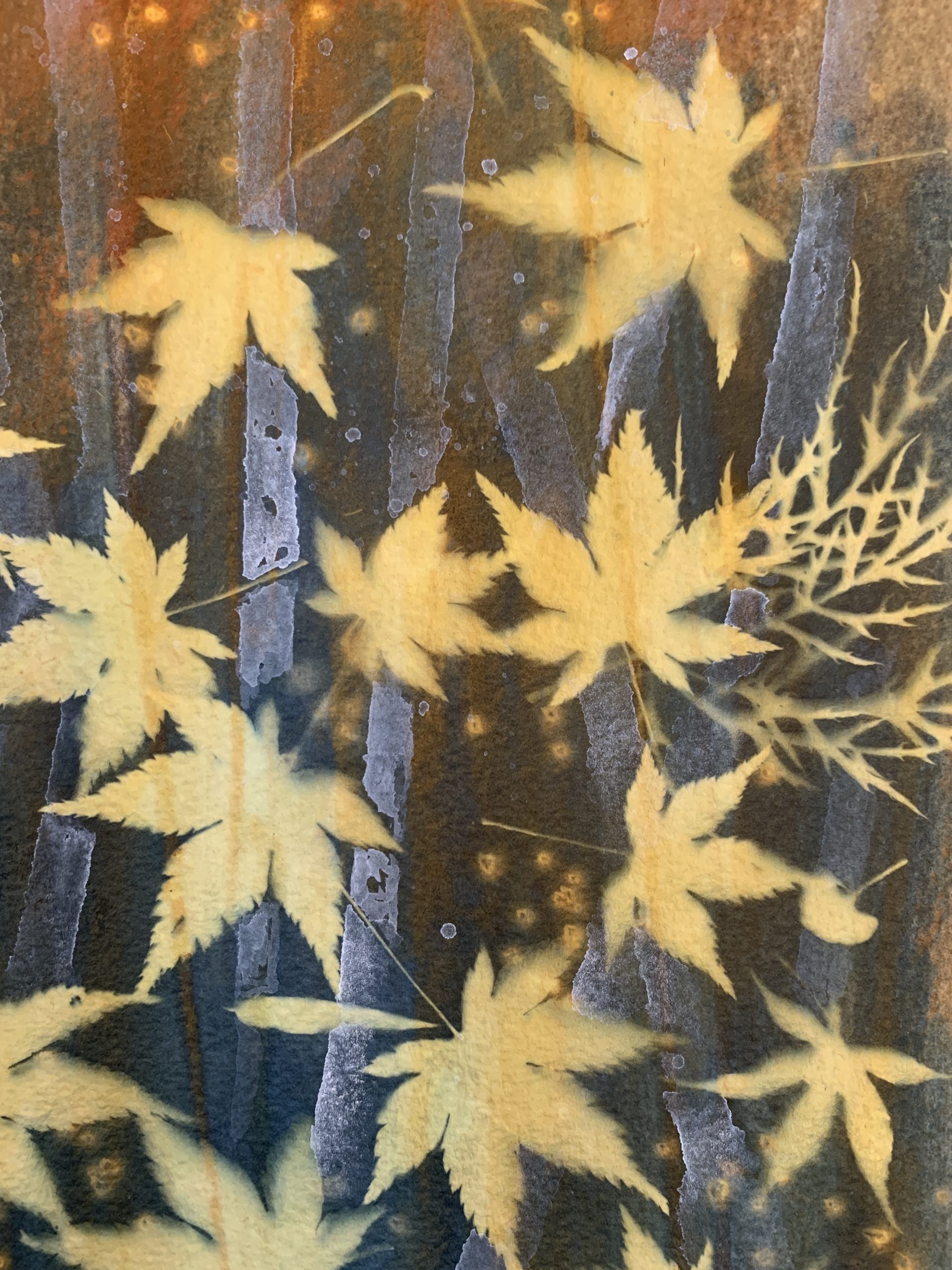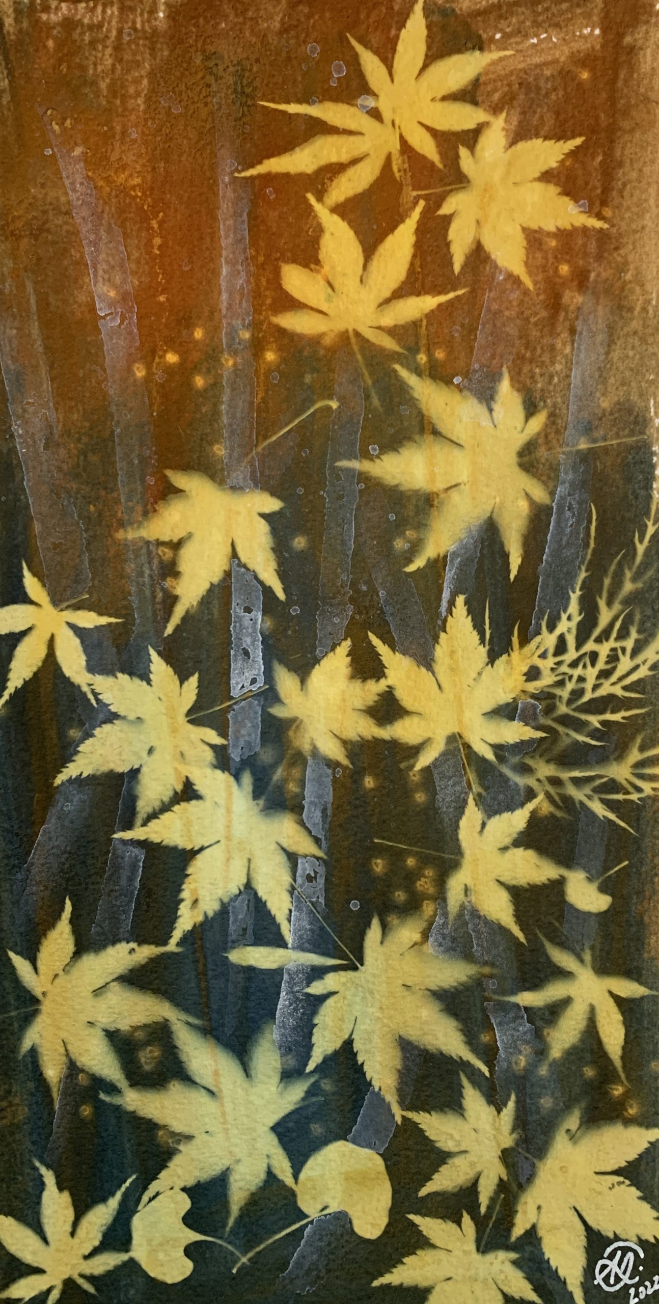Oeuvre Originale « Pluie d’Or » : Cyanotype, aquarelle et gouache, oeuvre originale signée et livrée avec un certificat d’authenticité.